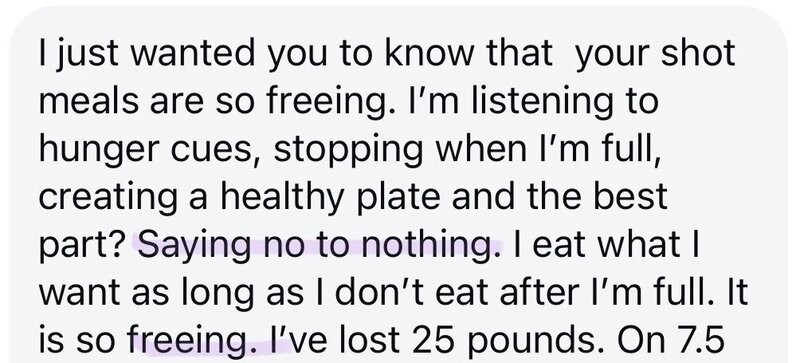 I created Shot Meals using my experience as a registered dietitian who has lost 50 pounds in a year taking weight loss medication so you don’t have to spend hours searching on Google for information that may or may not be correct. I removed the fluff from Shot Meals and only included advice that is tested, proven, and backed by science. My goal is for you to start getting sustainable results as soon as possible.